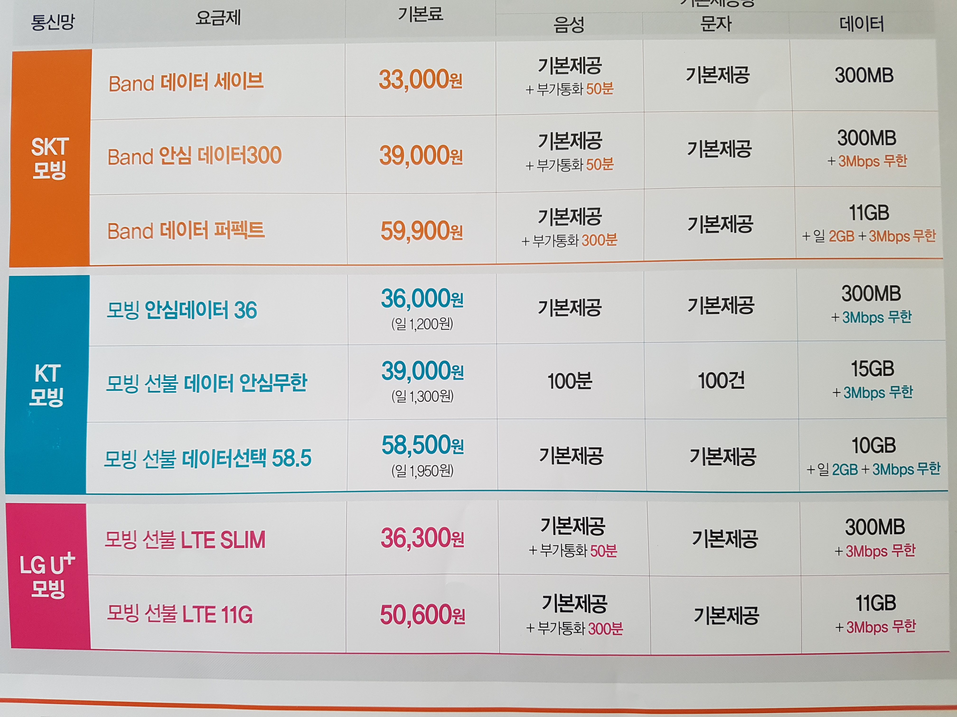 36000원 39000원, 58500원 요금제를 많이 사용합니다.
