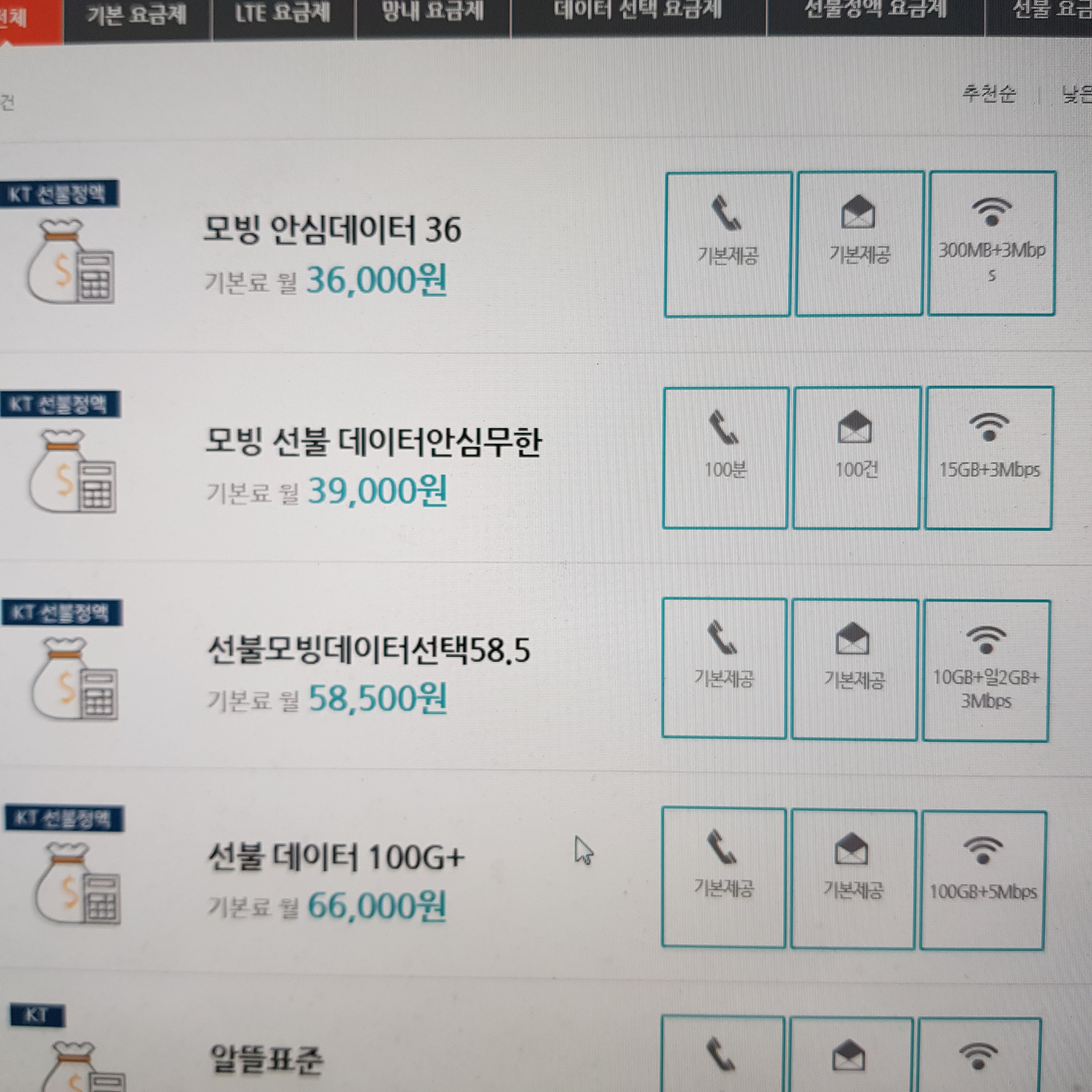 이외에도 다양한 요금제가 있습니다만,