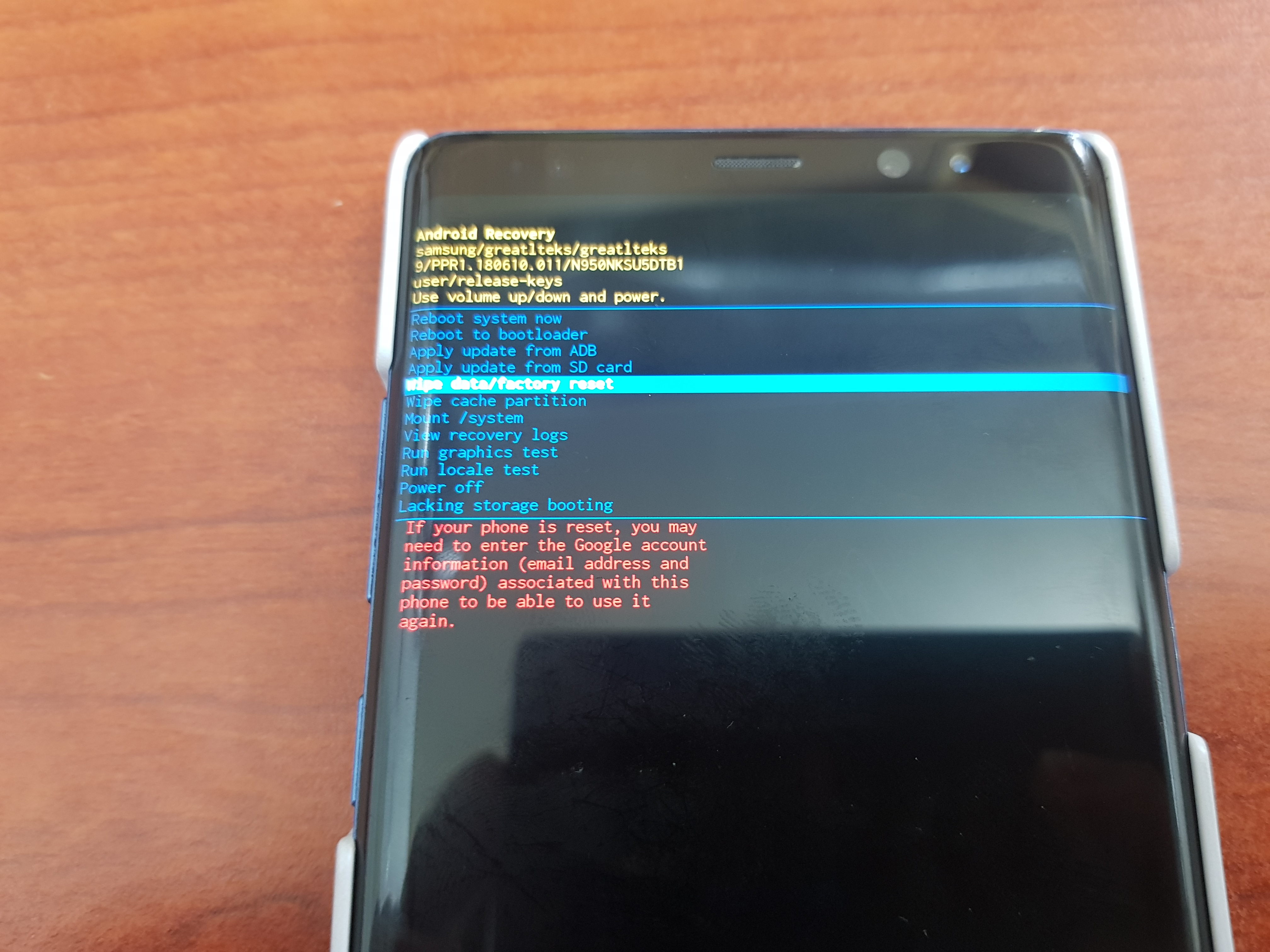 볼륨버튼으로 커서를 wipe data/factoryreset 옮기고 ,종료버튼으로 선택해줍니다.